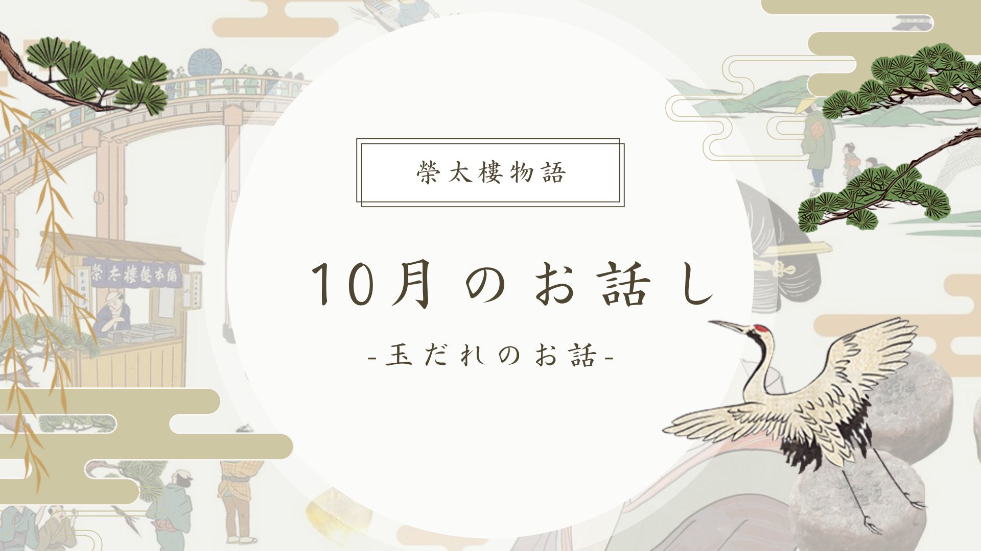 玉だれの菓銘由来は謡曲・能の中でも名曲にして難曲である「小町物」の一つである「鸚鵡小町(おうむこまち)」の一節から取られたもので、年老いた小野小町を労って時の帝である陽成天皇が「雲の上はありし昔に変らねど見し玉簾(たまだれ)の内やゆかしき」と問いかけの和歌を詠んだところ、小町は鸚鵡返しとして即座に「雲の上はありし昔に変らねど見し玉簾(たまだれ)の内ぞゆかしき」と「や」と「ぞ」を一文字変えて返歌を詠んだという。