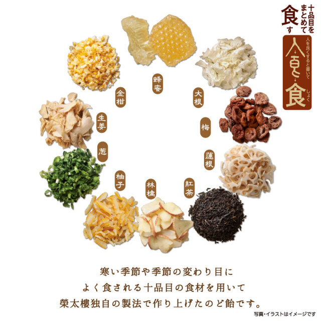 伝統的な食の知恵を活かし、季節の変わり目などに食すと良いとされる大根・生姜・蓮根・葱・金柑・林檎・柚子・梅・蜂蜜・紅茶の十種類の食材を組み合わせました。 榮太樓独自の製法で作りあげた、香料や着色料を使用しない本格派ののど飴です。