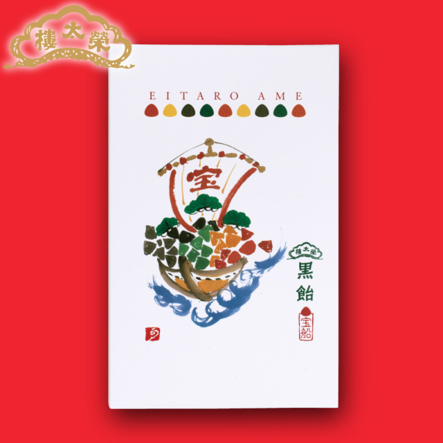 ■江戸初夢 宝船 黒飴 9粒入 お馴染みの榮太樓飴を新年のお祝いにぴったりのパッケージでお届けします。 <黒飴> 有平糖の製法で作られた、梅ぼ志飴の姉妹品。 沖縄産黒糖にほんのり桂皮末をまぶしました。 明治25年から守り続けた素朴な味わいです。