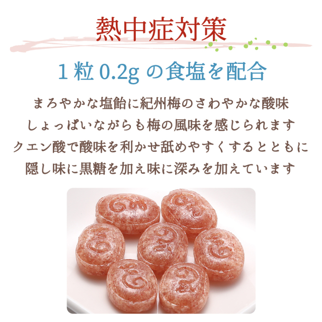 まろやかな塩飴に紀州梅の爽やかな風味が感じられます。無香料、無着色で、美味しく塩分補給。