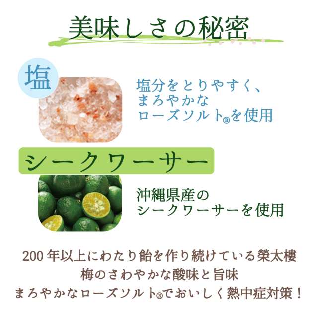 ローズソルト(R)使用の塩飴に沖縄県産のシークワーサーを合わせました。 沖縄の方言では、「シー」は「酸、酢」、クワーサーは「食わせるもの」。シークワーサーとは「酸を食わせるもの」という意味であることから、「酸い」を「シー(すぃ~)」と読ませて商品名としました。 その名の通り酸っぱい、暑い夏にぴったりの飴です。 無香料・無着色
