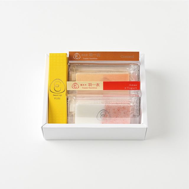 冬のおすすめ商品をセレクトしたギフトセットです。 贈り物のほか、ご自身へのご褒美としてもいかがでしょうか。 みつあめ スイートリップ「ゆず」はそのまま召し上がっていただくほか、お湯割りでドリンクとして楽しむお客様も多い一品です。 板あめ 羽一衣は、2種類の味が1枚で楽しめる「あまおう×ヨーグルト」と、ほろ苦さのある「キャラメル」をピックアップしました。 サクサクとした食感と口溶けをお楽しみください。