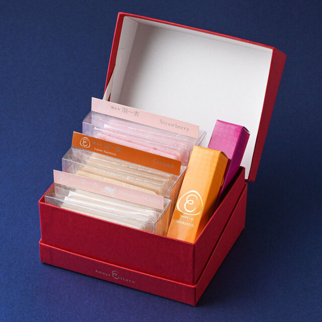 ~Twinkle Night~ きらめく冬の夜に、あめやえいたろうから贈る特別なひととき。 洗練された味わいとともに、心まで輝く贈り物をお届けします。 ルビーのように鮮やかで、華やかにきらめくひと箱。 スイートリップと板あめのクリスマス限定セットをご用意。 とろ~り、キラキラ輝くみつあめスイートリップから、 濃厚な味わいで後味すっきりの「コンコードグレープ」と 甘みと酸味のバランスが良いデコポンの一種である「不知火(しらぬい)」をセレクト。 パリッサクッとした食感と、口の中でふわりとほどけるやさしい甘みが魅力の板あめ羽一衣(はねひとえ)。 幅広い世代に人気の3種類。「ストロベリー」「キャラメル」「桃白鳳」を詰合せ。 「桃白鳳」は通常、伊勢丹新宿本店限定品となっており、今年はクリスマス限定で特別にご用意いたしました。 あめやえいたろうのきらめくキャンディーで素敵なクリスマスをお楽しみください。