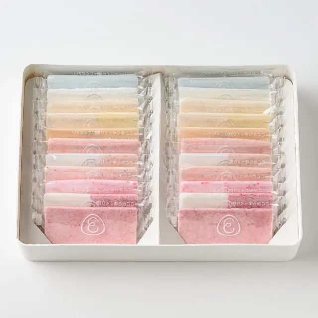 あめやえいたろうの定番商品「板あめ 羽一衣(はねひとえ)」 色とりどりの板あめは、いろは歌のように一つひとつが美しく、口に含むと、ふわりとやさしくほどけていきます。 羽一衣の魅力をじっくり味わっていただきたい、そんな想いから「いろは」は生まれました。 パッケージにあしらった、キラリと赤く輝く“羽”のモチーフは、天女の衣のように軽やかで繊細な羽一衣を表現しています。 通常は伊勢丹新宿本店・三越銀座店でしかお求めいただけない味を含む、全11種・各2枚入り。 味や香りの違い、「パリッ」「サクッ」と軽やかにほどける食感、そして多彩なアレンジまで、存分にお楽しみください。 ギフトにはもちろん、羽一衣の世界がさらに広く、たくさんの方へ届きますように。