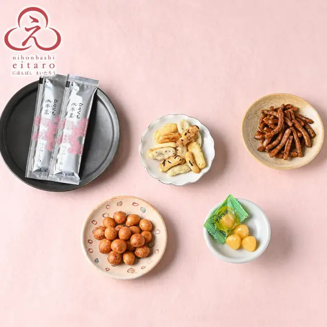にほんばしえいたろう おやつ菓子5袋の詰合せ。丸山珈琲かりんとう、柿の種ミックス、みたらしごろも ピーナッツ入り、果汁飴 温州みかん、ひとくち水羊かん「つぶし」 の5種類を詰合せた季節限定ギフトセットです。