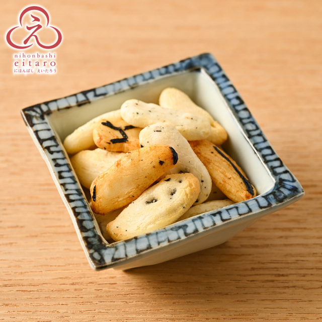 国内産有機もち米と特製醤油ダレを使用した柿の種。海苔、ごま、アオサ、海老、4種類の味をお楽しみください。