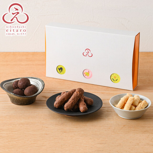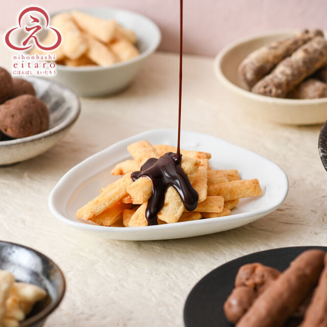 にほんばしえいたろうで人気のおやつ菓子に、それぞれのお菓子に一番相性の良いチョコレートをかけました。
