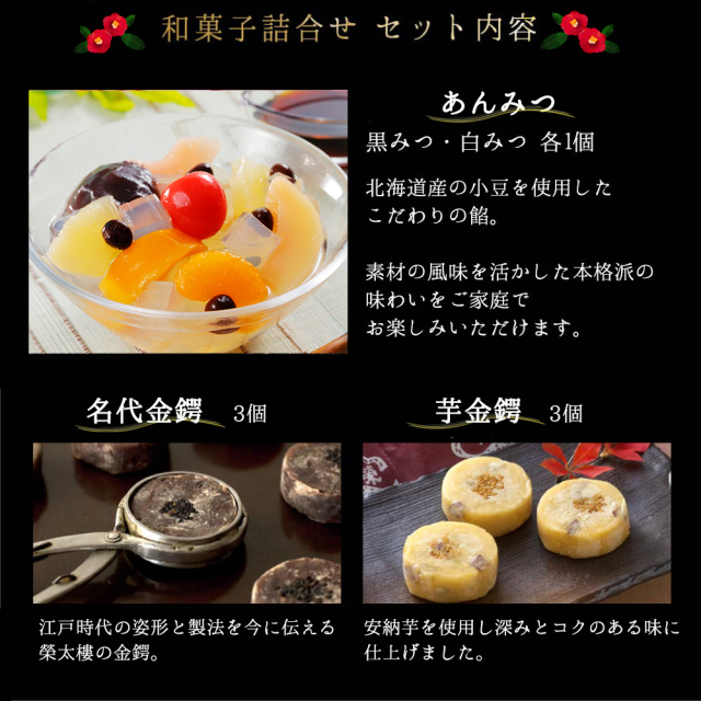 ご好評をいただいておりますあんみつと金鍔を贈り物にぴったりな竹かごに詰合せ、二色使いの華やかで上品な風呂敷でお包みいたしました。 「あんみつ(黒みつ・白みつ)各1個」「金鍔(名代金鍔・芋金鍔)各3個」の詰合せです。