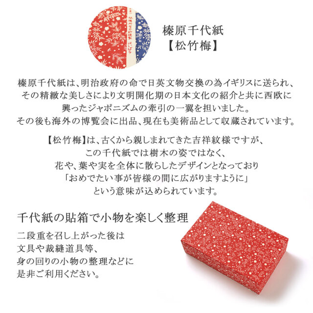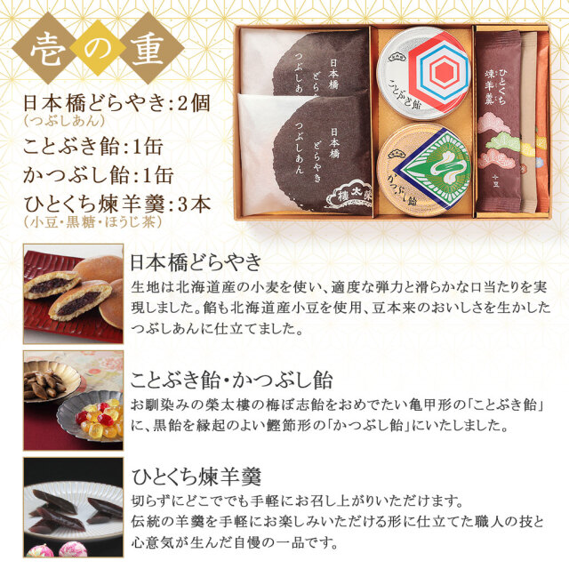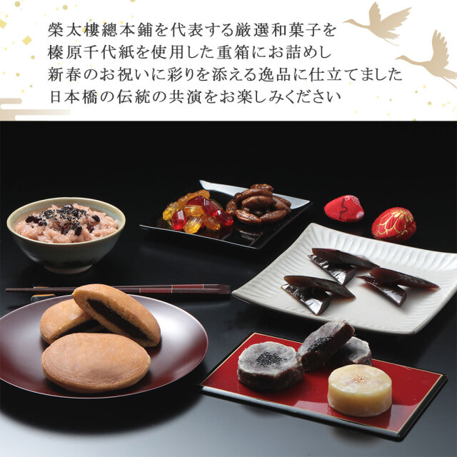 榮太樓總本鋪を代表する厳選和菓子を榛原千代紙を使用した重箱にお詰めし、新春のお祝いに彩りを添える逸品に仕立てました。 日本橋の伝統の共演をお楽しみください。 ※熨斗(のし)をお付けすることが可能です。ご希望の場合は、ご注文時の選択項目からお選びください。
