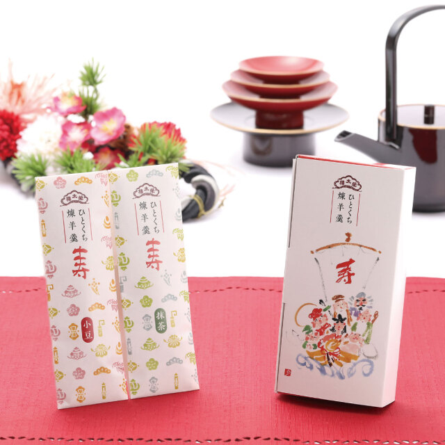 箱に七福神のデザインを施し、ポチ袋にもお正月モチーフの絵柄をちりばめ、新しい年のご挨拶に相応しい縁起のよいパッケージに仕立てました。 手軽にお召し上がりいただけるサイズです。 熟練した職人によって受け継がれてきた榮太樓伝統の羊羹をもっと手軽にお楽しみいただける形に仕立てました。 持ち歩きにも便利な大きさで、日持ちも長いのでお土産好適品です。