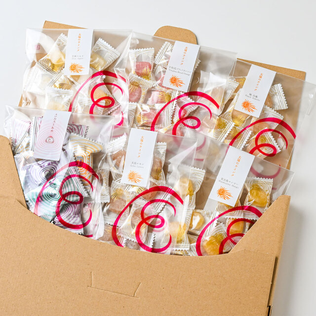 えいたろうあめ10粒入と果汁あめ10粒入各種の合計6袋のネコポス便対応商品です。