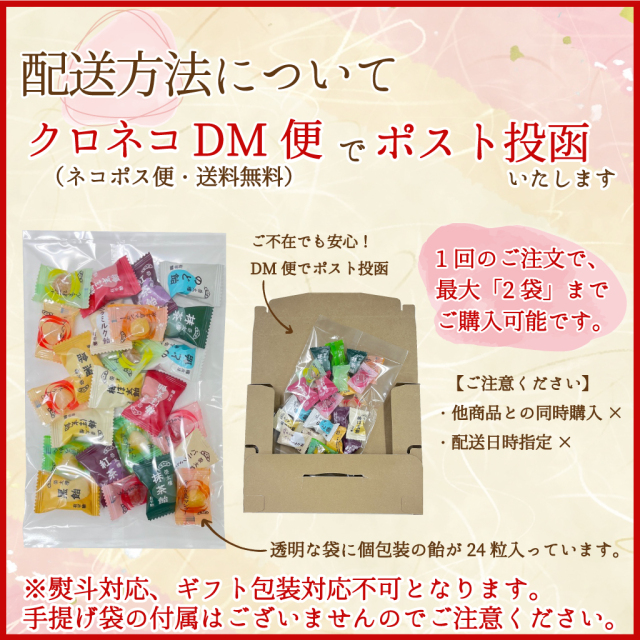 ■榮太樓飴 果汁飴 12種24粒 お試しセット(ネコポス便 送料無料) 榮太樓の代表銘菓である「榮太樓飴(梅ぼ志飴、黒飴、抹茶飴、紅茶飴、のど飴、バニラミルク飴)」と、「果汁飴(あまおう、大長れもん、宮古島マンゴー、王林りんご、温州みかん)」。 気軽にお試しいただけるよう、ポケットや鞄に入れて持ち運びやすい個包装タイプを各2粒ずつ計24粒を詰め合わせました。 初めて榮太樓飴や果汁飴をお召し上がりになる方や、色々な味をちょっとずつお楽しみになりたい方に是非お試しいただきたいセットです。(オンラインストア限定) ネコポス便(ヤマト運輸 DM便)送料無料でお届けいたします。