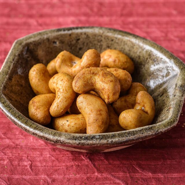 カシューナッツに衣掛けし、数種類のスパイスを配合したカレーをかけました。
