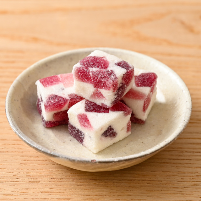 寒天とメレンゲを合わせたふわふわの寒天ムースに甘酸っぱい小粒のぶどうゼリーをちりばめました。